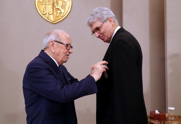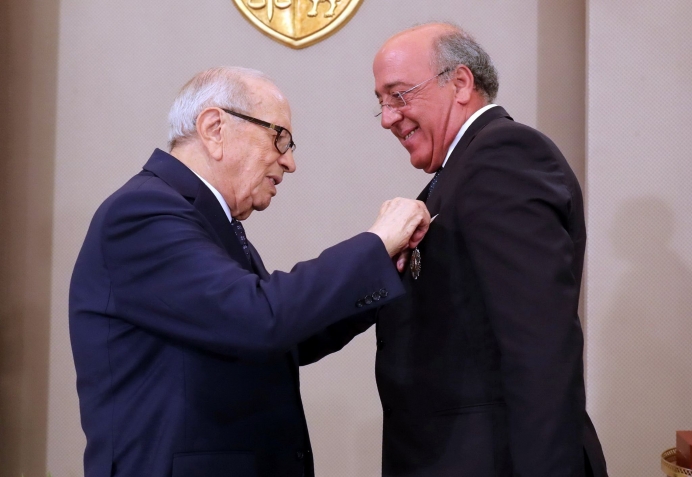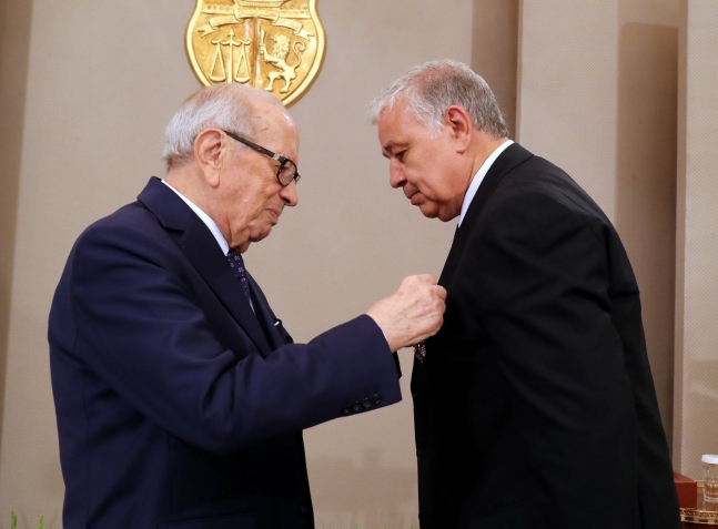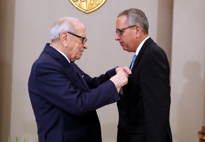 وتولّى رئيس الدولة في نهاية الموكب توسيم ثلّة من إطارات وزارة الشؤون الخارجية بوسام الجمهورية تقديرا لما تميّزوا به من عمل واخلاص للوطن وهم: