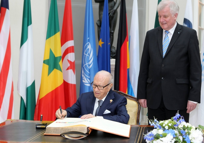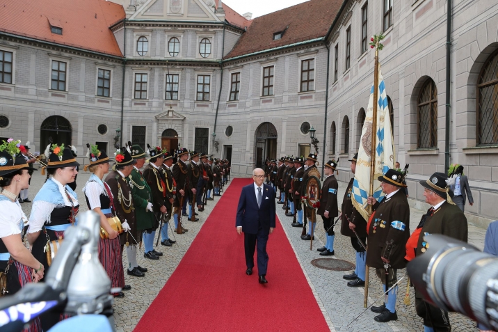 وصول رئيس الجمهورية إلى مونيخ ومشاركته في موكب الاستقبال الذي انتظم في قصر الوزير الرئيس لمقاطعة بافاريا على شرف رؤساء الدول والحكومات وكبار مسؤولي المنظمات الدولية المشاركة في قمة مجموعة السبع الكبار .