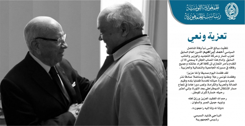 تلقّيت ببالغ الأسى نبأ وفاة المناضل السياسي أحمد إبراهيم الأمين العام السابق لحزب المسار وحركة التجديد والوزير والنائب السابق. وأمام هذا المصاب الجلل لا يسعني إلا أن أتقدم بأحر التعازي إلى كافة أفراد عائلته وجميع رفاقه في مسيرته الجامعية والنضالية والحزبية.
