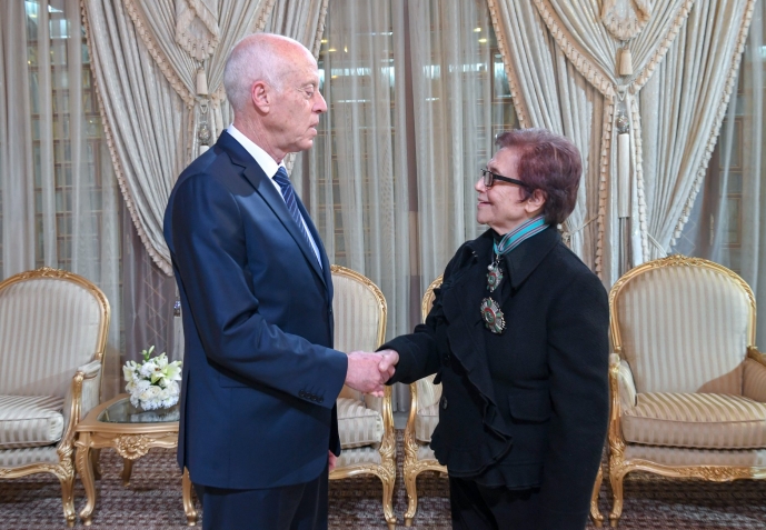 وتولى رئيس الدولة تكريم السيدة جميلة بوحيرد، بمنحها الصنف الأول من وسام الجمهورية التونسية تقديرا لمكانتها ولنضالاتها الطويلة من أجل تحرير الجزائر من الاستعمار الفرنسي، ولكفاحها المستمر دفاعا عن الحريات.