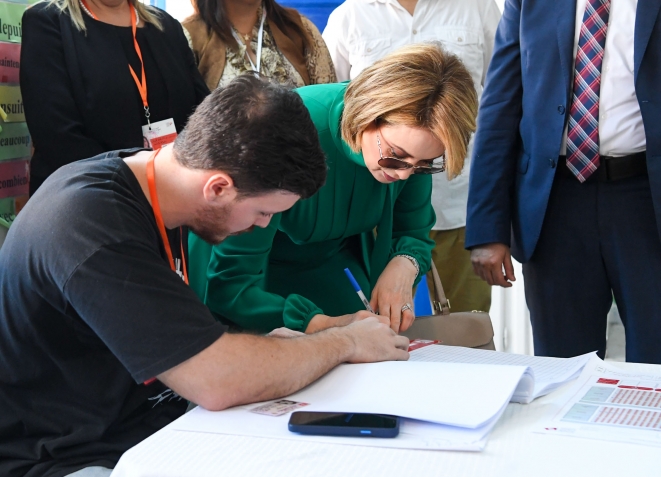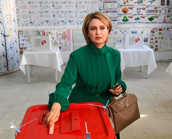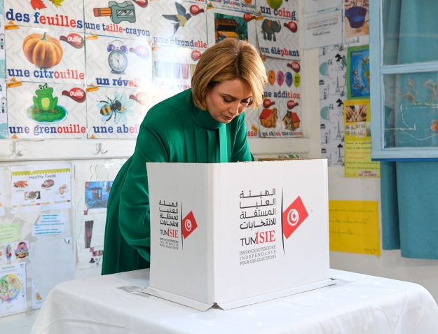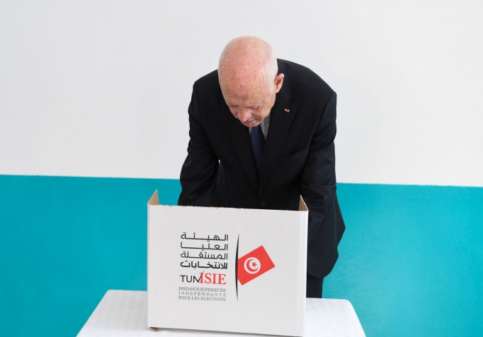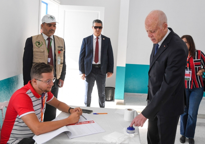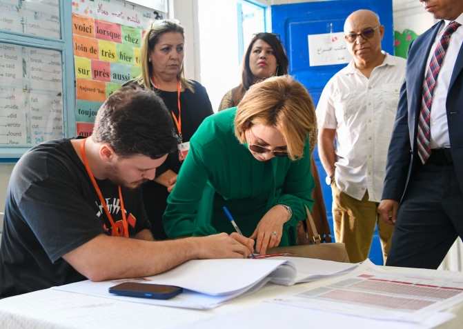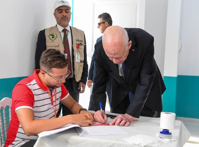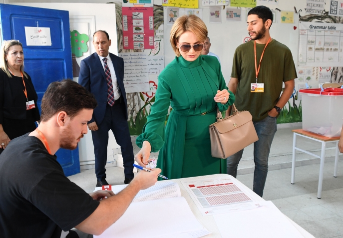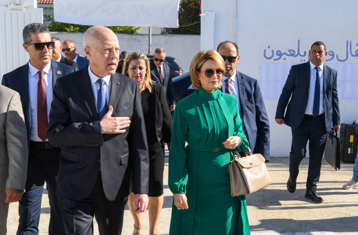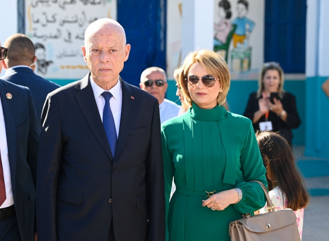 رئيس الجمهورية قيس سعيد و حرمه يدليان بصوتيهما في الإنتخابات الرئاسية بالمدرسة الإبتدائية حي النصر1.