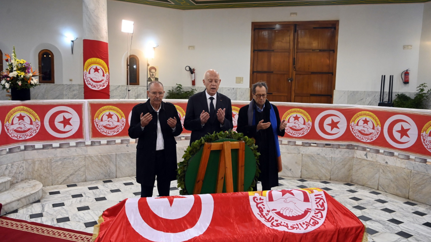 إشراف رئيس الجمهورية قيس سعيّد على موكب إحياء الذكرى 72 لاغتيال الزعيم النقابي فرحات حشاد، بضريح الشهيد بالقصبة