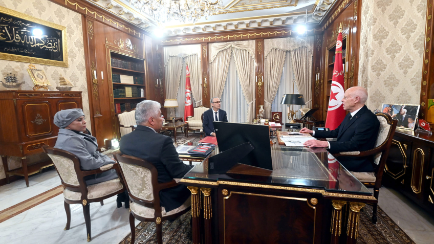 لقاء رئيس الجمهورية قيس سعيّد مع كلا من السيدين عصام الأحمر، وزير الشؤون الاجتماعية، ورياض شوّد، وزير التشغيل والتكوين المهني، والسيدة حسناء جيب الله، كاتبة الدولة لدى وزير التشغيل والتكوين المهني المكلفة بالشركات الأهلية
