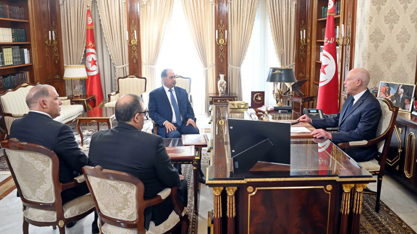 لقاء رئيس الجمهورية قيس سعيد مع السيد أحمد الحشاني، رئيس الحكومة والسيدة سهام البوغديري نمصية، وزيرة المالية
