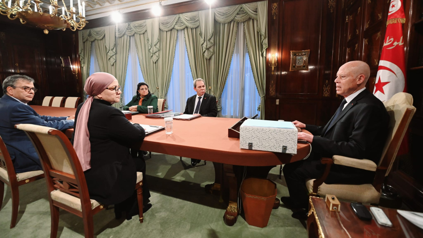 إشراف رئيس الجمهورية قيس سعيّد على اجتماع ضم كلا من السيد أحمد الحشاني، رئيس الحكومة، والسيدتين ليلى جفال، وزيرة العدل، وسهام البوغديري نمصية، وزيرة المالية، والسيد فتحي زهير النوري، محافظ البنك المركزي