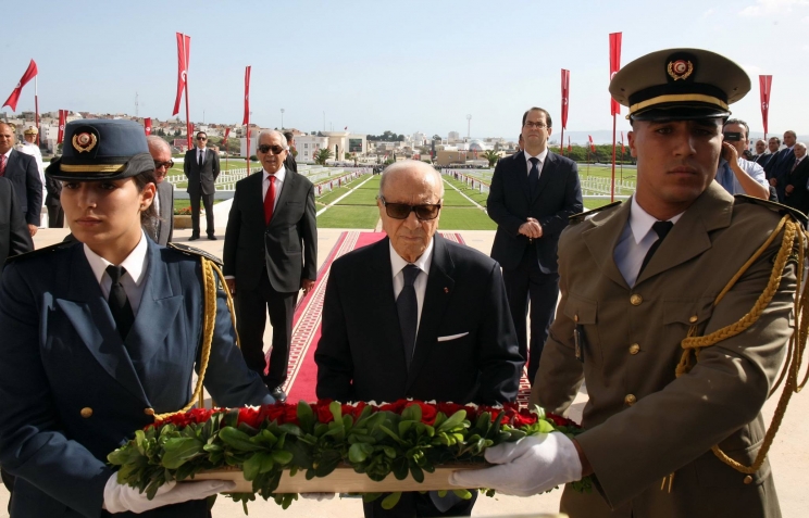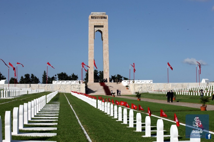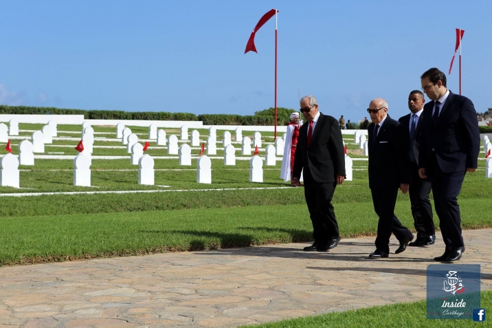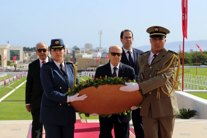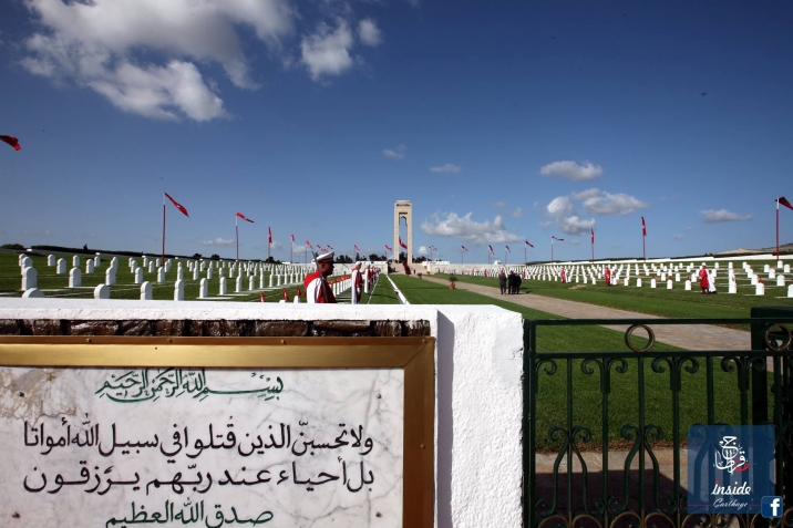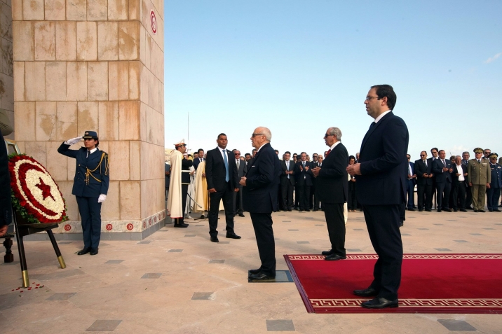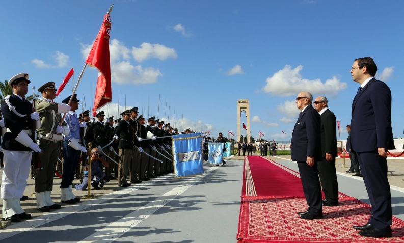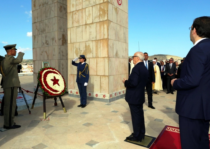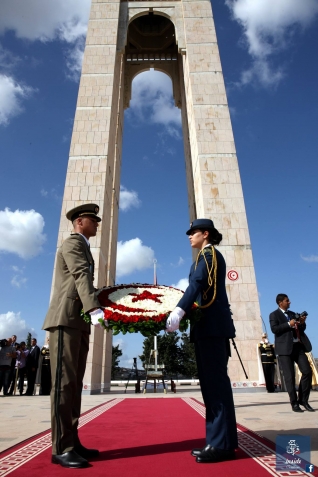 و تولى رئيس الجمهورية الذي كان مرفوقًا برئيس مجلس نواب الشعب ورئيس الحكومة، تحية العلم على أنغام النشيد الوطني واستعراض تشكيلة شرفية من الجيوش الثلاثة بروضة الشهداء.